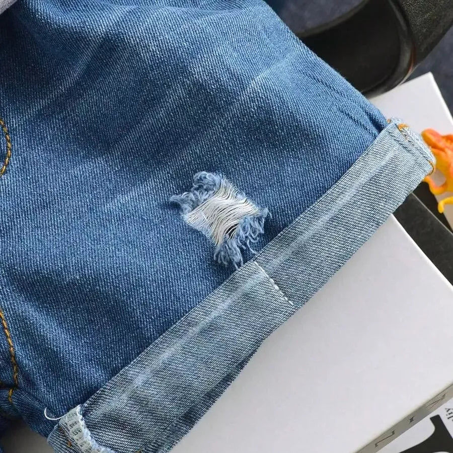 O kit é composto pela camiseta em malha macia (rico em algodão) e um short jeans super estiloso com elástico na cintura e detalhes "destroyed" (rasgadinhos). É o look perfeito para estimular a imaginação e garantir conforto nos dias de verão.
